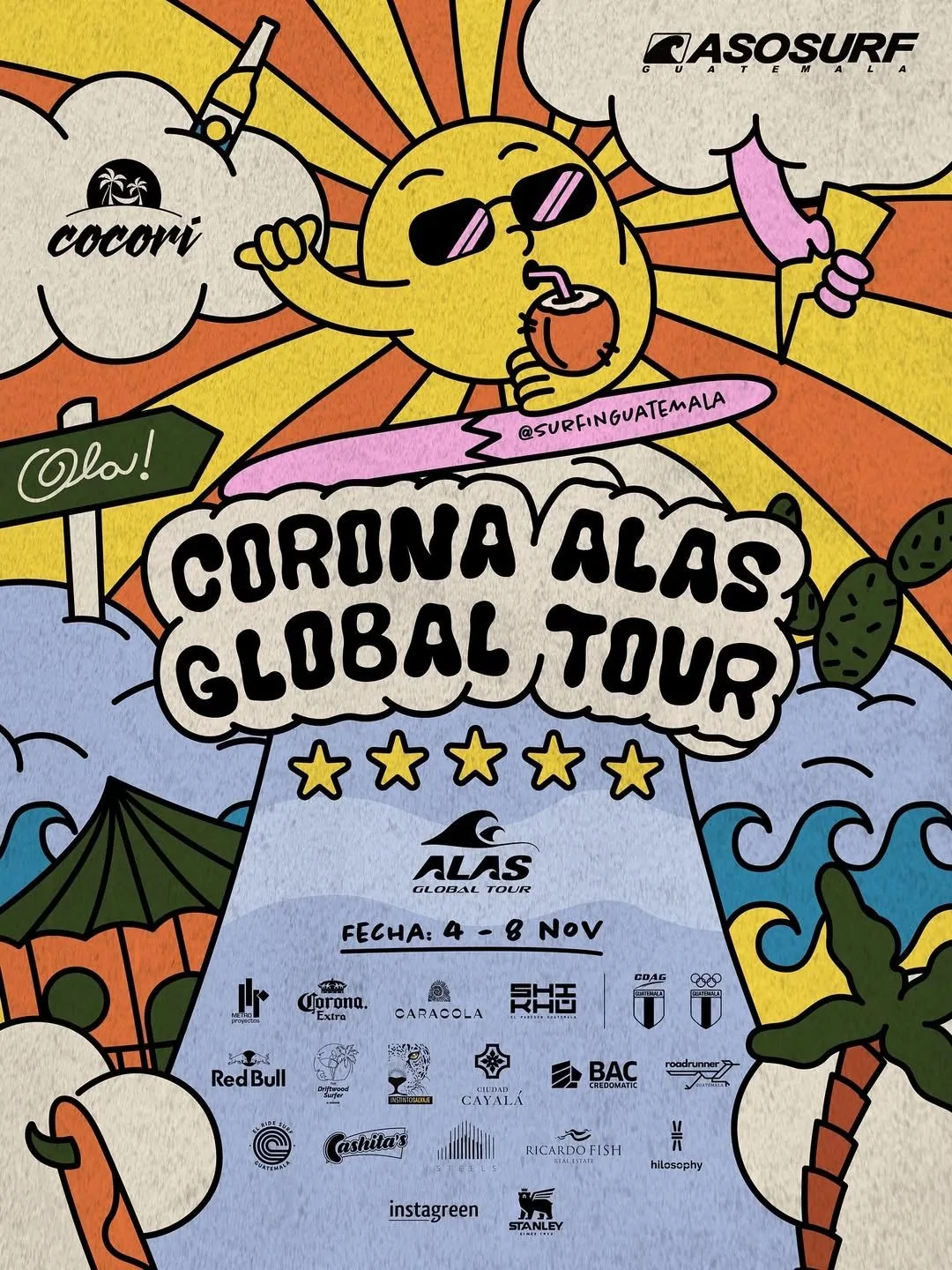 🌴 Organización nacional y respaldo institucional El Corona ALAS Global Tour Guatemala 2025 es coordinado por la Asociación Deportiva Nacional de Surf de Guatemala (ADNSURF), con el apoyo de grandes patrocinadores encabezados por Corona, marca reconocida por su compromiso con el surf y la conservación del entorno marino.